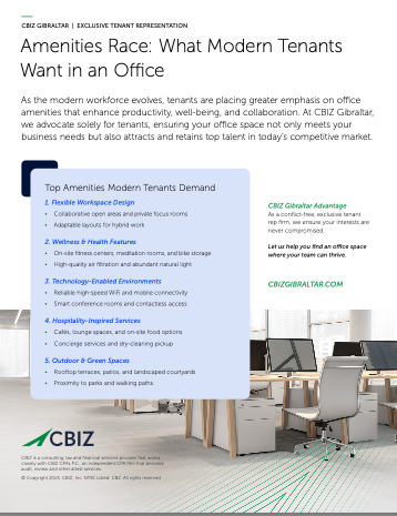 As the modern workforce evolves, tenants are placing greater emphasis on office amenities that enhance productivity, well-being, and collaboration. At CBIZ Gibraltar, we advocate solely for tenants, ensuring your office space not only meets your business needs but also attracts and retains top talent in today’s competitive market.